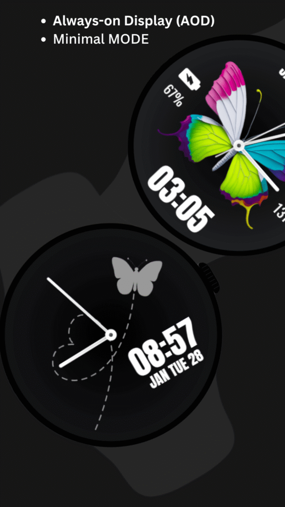 The Butterfly Watch Face for Wear OS is a perfect blend of vibrant design and smart utility. With features like steps counter, battery percentage, ambient mode, and Always-On Display support, it delivers both beauty and practicality.